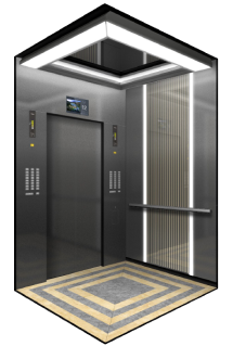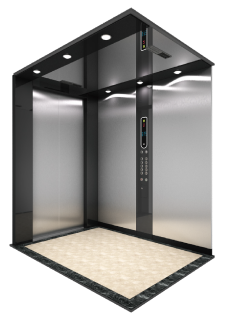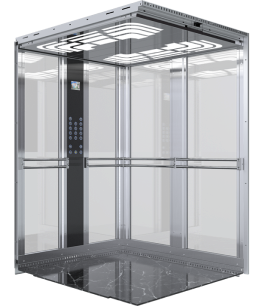 Стены купе кабины — из металлопласта DL40CE. Двери кабины и шахты — из металлопласта DL40CE или нержавеющей стали. Угловые элементы, а также плинтус и поручень, потолок — из шлифованной «нержавейки». Зеркало устанавливается на задней стене кабины во всю ее высоту. Освещение — плафон с декоративной перфорацией, светодиодные светильники. Пол — из керамогранита.